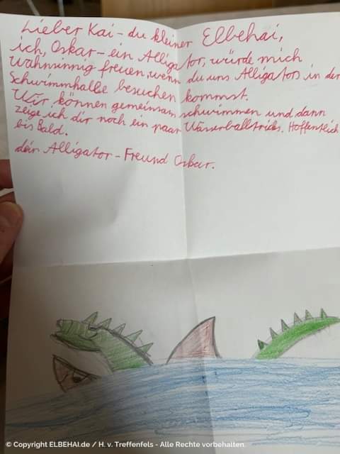 Der kleine WUM Alligator Oskar hat den Elbehai per Fan-Post angeschrieben und ihn zu einem WUM-Training in die Schwimmhalle, Große Diesdorfer Str. eingeladen. Am Mittwoch, 20.12.2023, war Kai, der Elbehai, in unserem Wohnzimmer zu Besuch. Welche Abenteuer und Entdeckungen er im Wasser erlebte, könnt Ihr in einer Geschichte im neuen Buch lesen. Wann die neue Ausgabe erscheint, erfahrt Ihr auf der "Haiseite" www.elbehai.de.