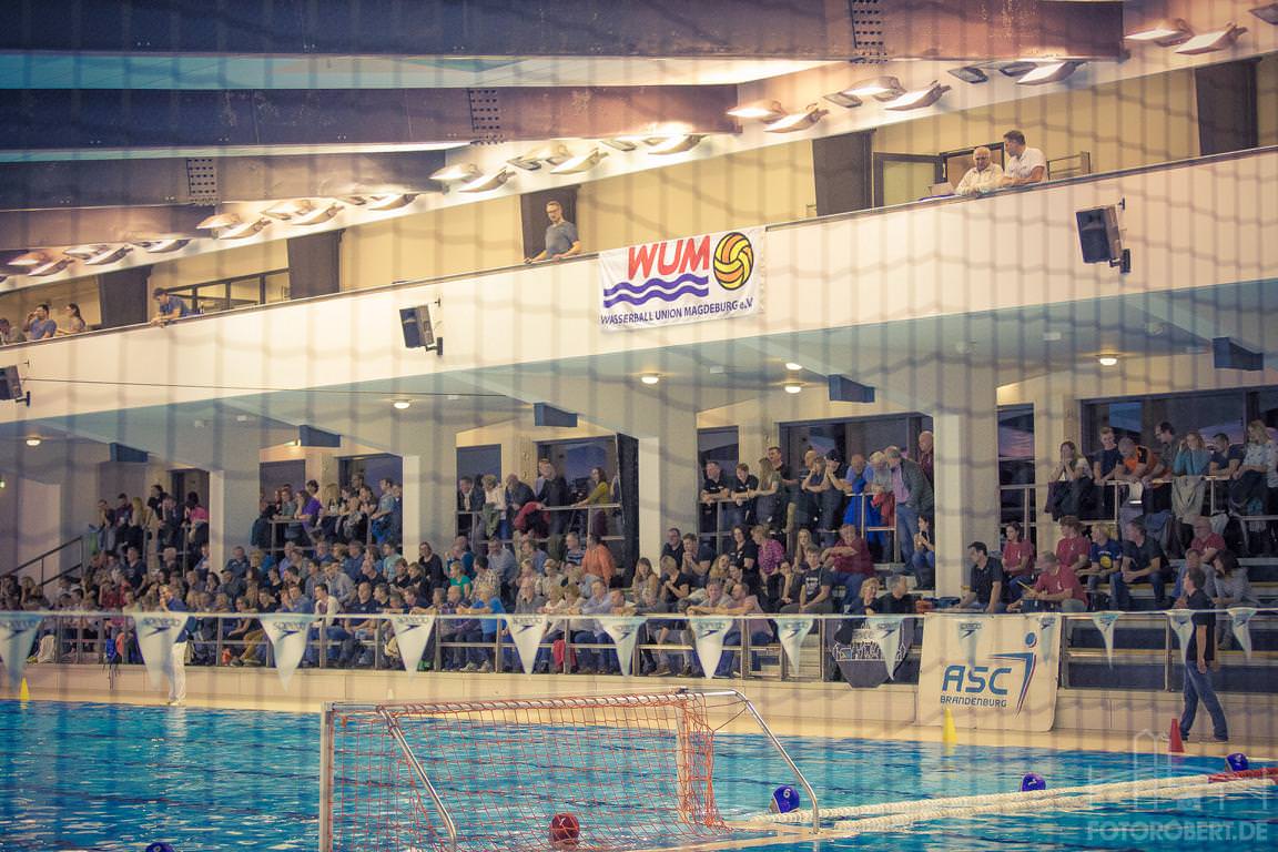 Doch was war das für ein Spiel! Emotionen, klasse Wasserball, tolle Stimmung von der mit 170 Zuschauern gut gefüllten Tribüne und packende Zweikämpfe – das Match hielt, was alle erwartet hatten. Im ersten Viertel tasteten sich beide Mannschaften ab und versuchten mit einem starken Pressing, den Gegner vom Tor wegzuhalten. Eine Lücke in der Magdeburger Deckung nutzten die Gäste zwar zur 0:1 in Führung, doch dann kam Tom Hagendorf. Er glich nicht nur zum 1:1 aus, traf auch zum zwischenzeitlichen 2:2. Wie er sich in Centerposition jeweils 1:1 durchsetzte, war sehenswert. Die Gäste ließen zwei weitere Treffer zum 2:4 Endstand nach dem ersten Viertel folgen. In der Pause gab es neue taktische Anweisungen durch WUM Trainer Holger Dammbrück. Und die brachten gleich zwei schnelle und erneut tolle Tore von Tom Hagendorf zum 4:4 Ausgleich. Und es blieb vorerst sein Spiel. Immer wieder herrlich durch seine Mitspieler in Szene gesetzt, ließ er zwei weitere Treffer zum 6:6 Ausgleich folgen. Doch Brandenburg nutzte zwei Überzahlspiele konsequent und ging mit einer 6:8 Führung in die Halbzeitpause. Zu diesem Zeitpunkt war WUM Regisseur Holger Dammbrück schon nicht mehr im Spiel. Er musste nach drei persönlichen Fehlern bereits Mitte des 2. Viertels das Becken verlassen – ein herber Verlust für die Magdeburger. Im dritten Spielabschnitt ging es dann drunter und drüber, wurde es hektisch. Die Magdeburger haderten ein ums andere mal mit den Schiedsrichterentscheidungen, wurden unkonzentriert. Brandenburg blieb unbeeindruckt und führte plötzlich mit 6:10. Wilhelm Block und Lukas Schulle brachten die Magdeburger mit schönen Würfen in den Torwinkel noch einmal auf 8:10 heran, aber ein weiterer Treffer ließ die Gästeführung vor den letzten acht Minuten auf 8:11 ansteigen. Im letzten Viertel fehlte der WUM eine klare Linie. Die Havelstädter spielte ruhig und clever einen 8:13 Vorsprung heraus, ehe Ilia Butikashvili mit zwei Treffern noch etwas Ergebniskosmetik zum 10:13 Endstand herstellte. WUM Trainer Holger Dammbrück war nach dem Spiel angefressen: „Es war das erwartet schwere Spiel, leider mit dem schlechteren Ende für uns. In der ersten Halbzeit hatten wir mit Tom Hagendorf den überragenden Akteur im Wasser. Aber während des gesamten Spiels haderten wir leider zuviel mit den Schiedsrichterentscheidungen, haben uns nicht auf das Spiel und den Gegner konzentriert. Das haben die Gäste clever ausgenutzt. Zudem stand unsere Abwehr leider nicht so wie in den vergangenen Partien. Auch haben wir zu oft Latte oder Pfosten getroffen. Und mein frühes Ausscheiden war auch nicht gerade optimal.“ Mit dieser Niederlage rutschen die Magdeburger erst einmal aus der Tabellenspitze. Aber bereits am nächsten Wochenende können sie es beim Auswärtsspiel bei der SGW TuR Dresden wieder gut machen.